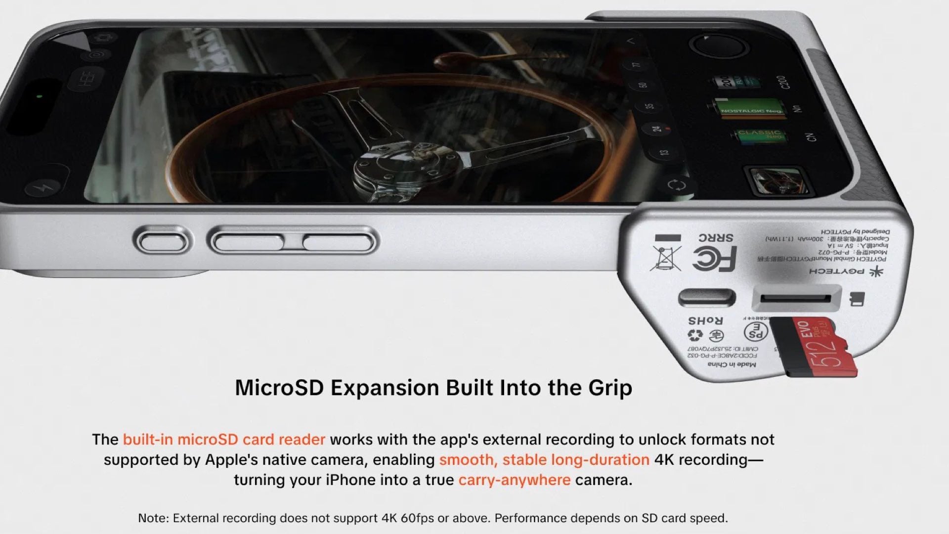 Beyond ergonomics, the kit enhances imaging capabilities. It integrates with the PGYTECH Pro Imaging app, offering manual controls, film-style filters, and a retro-inspired interface. The system also supports external recording via a built-in microSD slot, enabling higher-capacity storage and full-format recording without relying solely on the phone’s internal memory.