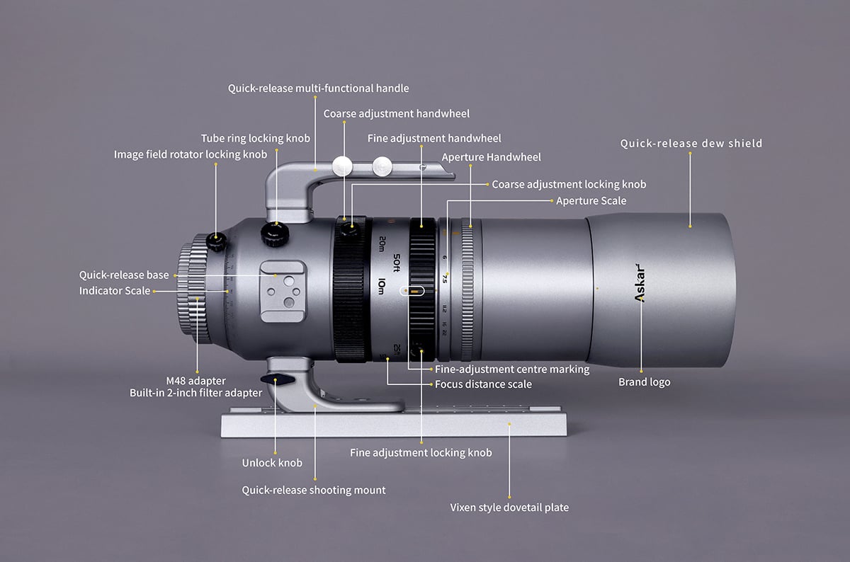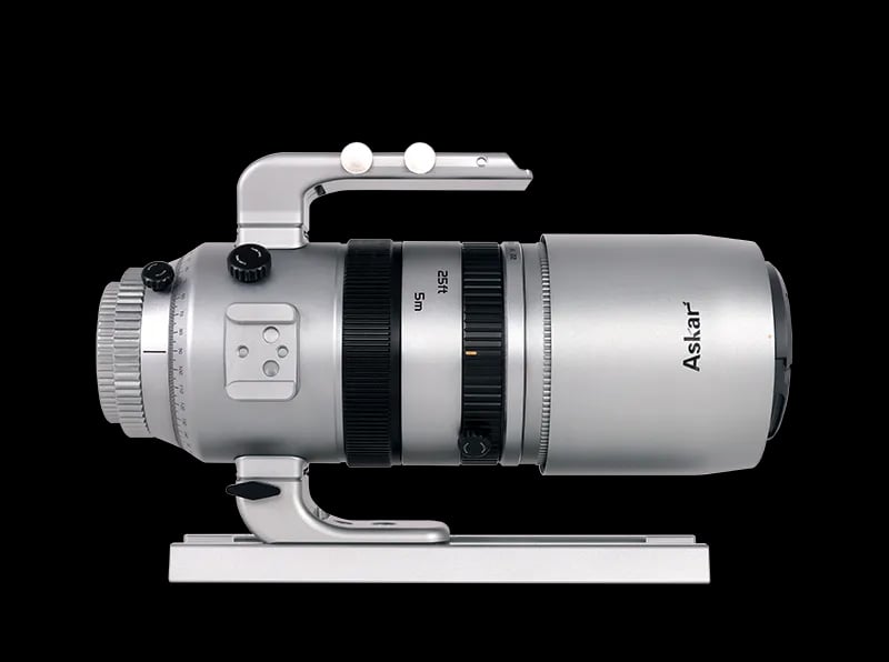 The front of the telescope accepts M67 filters. The mechanical housing includes a sliding dew shield, a solid handle, and a standard dovetail plate. The construction supports frequent field use. Askar uses a metal tube and machined components to keep the system stable when the camera attaches to the rear. The finish reflects the company’s current design direction, with red and grey accents similar to its newer product line.