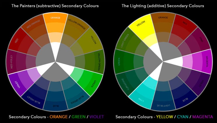 Now that we know what the primary colours are for both the painters colour wheel and the lighting colour wheel we can start to take a look at how these primary colours mix to create other colours. As we start to mix these colours we can now see why these colour wheels are laid out the way they are. Take a look at the two sets of colour wheels below to see what I mean.