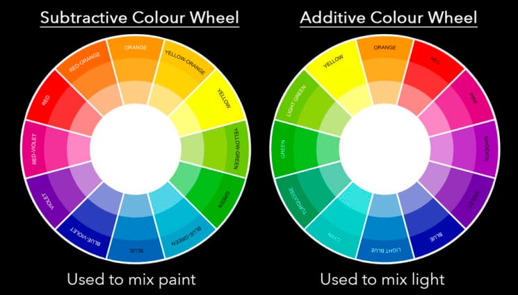 The physical mixing of colours is refereed to via a ‘subtractive’ colour wheel and this is used in reference to mixing colours like paint. Light hits the paint on a canvas and is reflected back into our eyes and we see the colour that way. This is the regular colour wheel we’re all used to seeing and using.