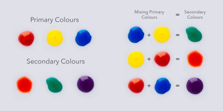 Now let’s take a look at how those secondary colours are created by mixing two primary colours.