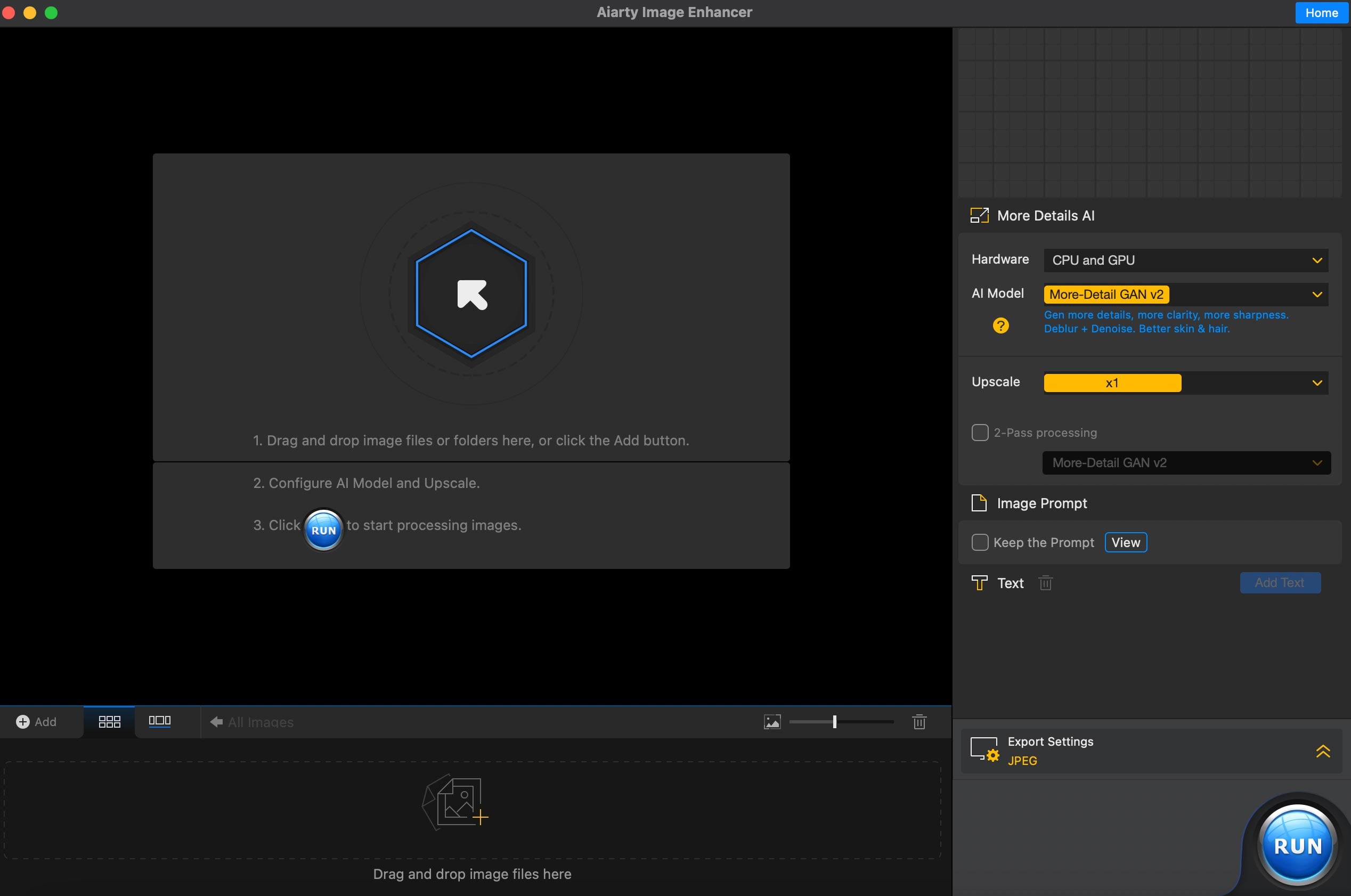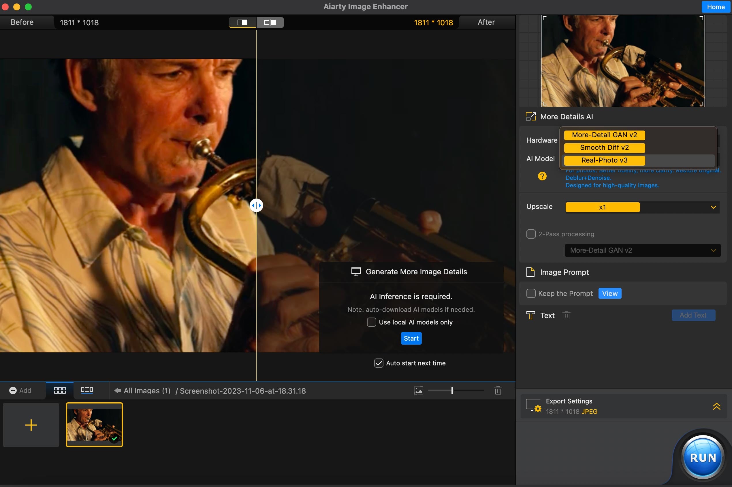 Using Aiarty couldn’t be simpler. After downing and opening up the app, drag the image you want to work on into the window for processing. If you prefer you can also upload an entire folder and batch process them. Then you choose which of the three models fits your needs best, and select from the drop down menu. Here you can choose between More detail Gan, Smooth Diff, or Real Photo.