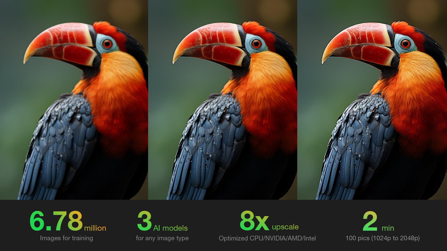 All three models also feature the powerful upscale model, effortlessly changing low-resolution photos to 2K, 4K, 8K, or even 32K quality. This is particularly useful for AI-generated images made with Midjourney or Stable Diffusion which have a limited and low resolution output.