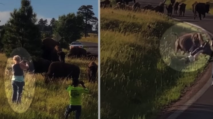 The incident happened last Wednesday within a group of motorcyclists who were in the Black Hills for the Sturgis Motorcycle Rally. There was a herd of buffalo on the road so the riders stopped. Many of them took their phones out and started filming and taking photos. But one woman got way too close to the animals. It was an incident waiting to happen, and one of the folks from the group caught everything on camera.
