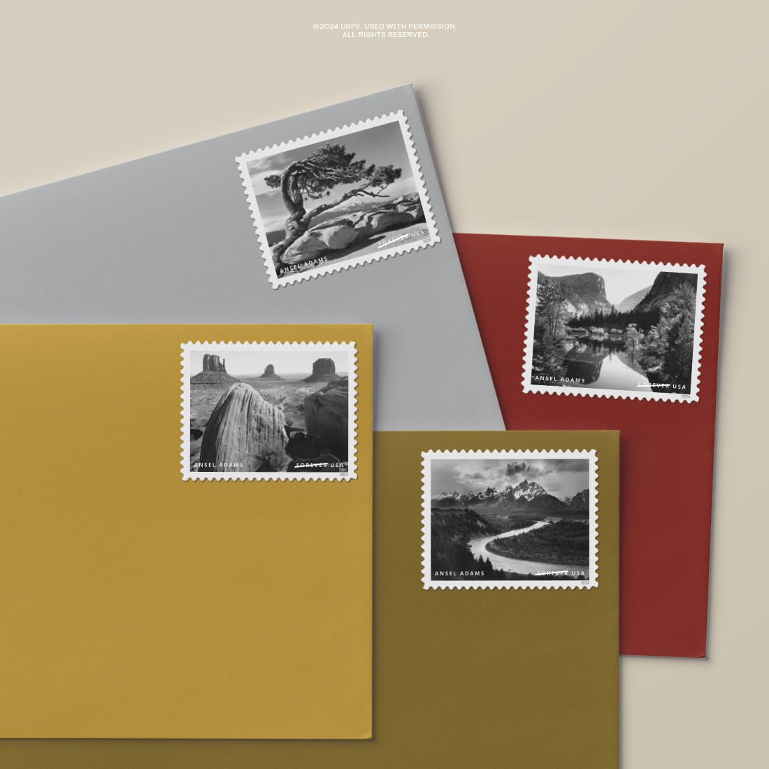 The stamps feature some of Adams’ most famous works, including Half Dome, Tetons and Snake River, Monument Valley, Arizona, and Maroon Bells, near Aspen, Colorado.