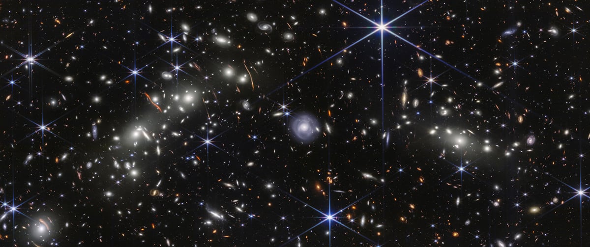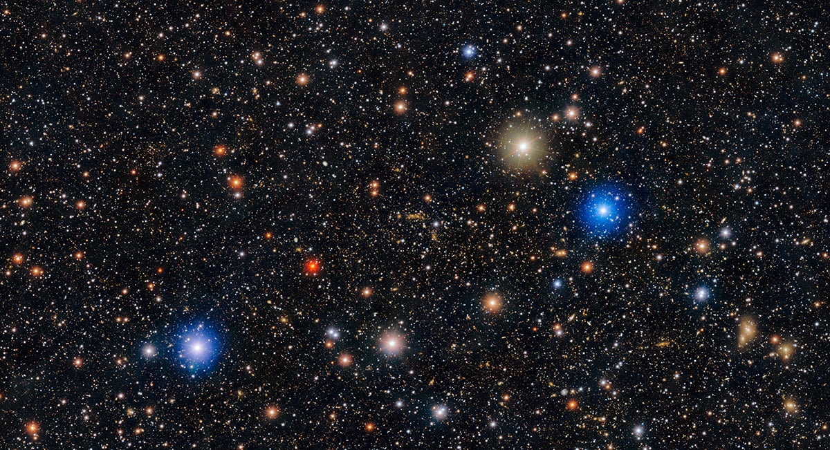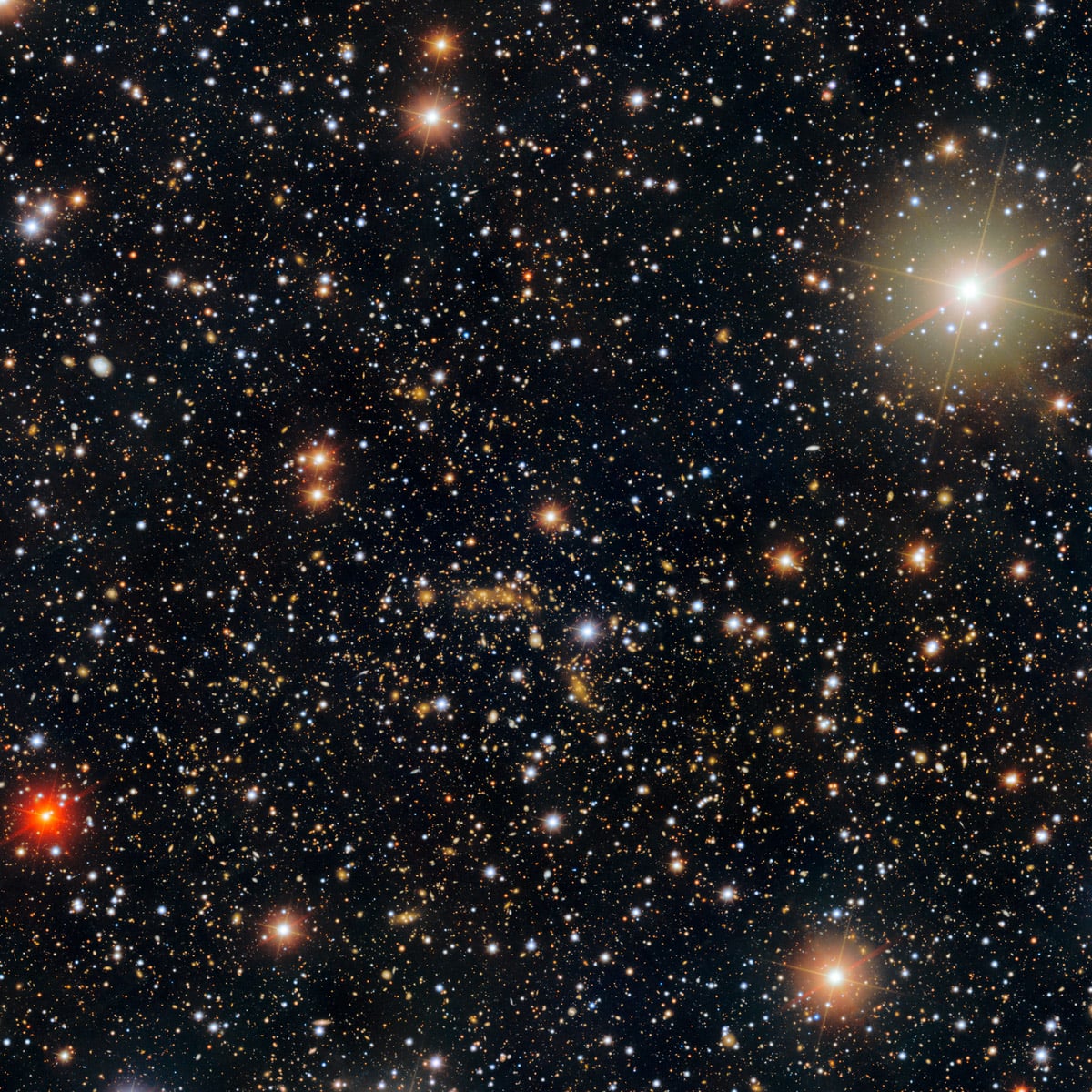 DECam observes in optical wavelengths, similar to what human eyes would perceive if we could see faint astronomical objects. Each point of light in the DECam image represents a galaxy, whether part of the cluster or far behind it. The camera’s depth and resolution help scientists study the distribution of matter and the lensing effects that reveal invisible mass.