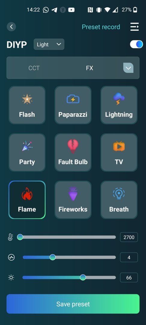 You can also go into the effects mode and select between Paparazzi, Firework, Lightning, Fault Bulb, TV, Breath, Flash, Party, and Flame effects. And within each effect, you can control its brightness, temperature, and frequency. If you like the physical controls on the light, you’ll find the app very easy to use.