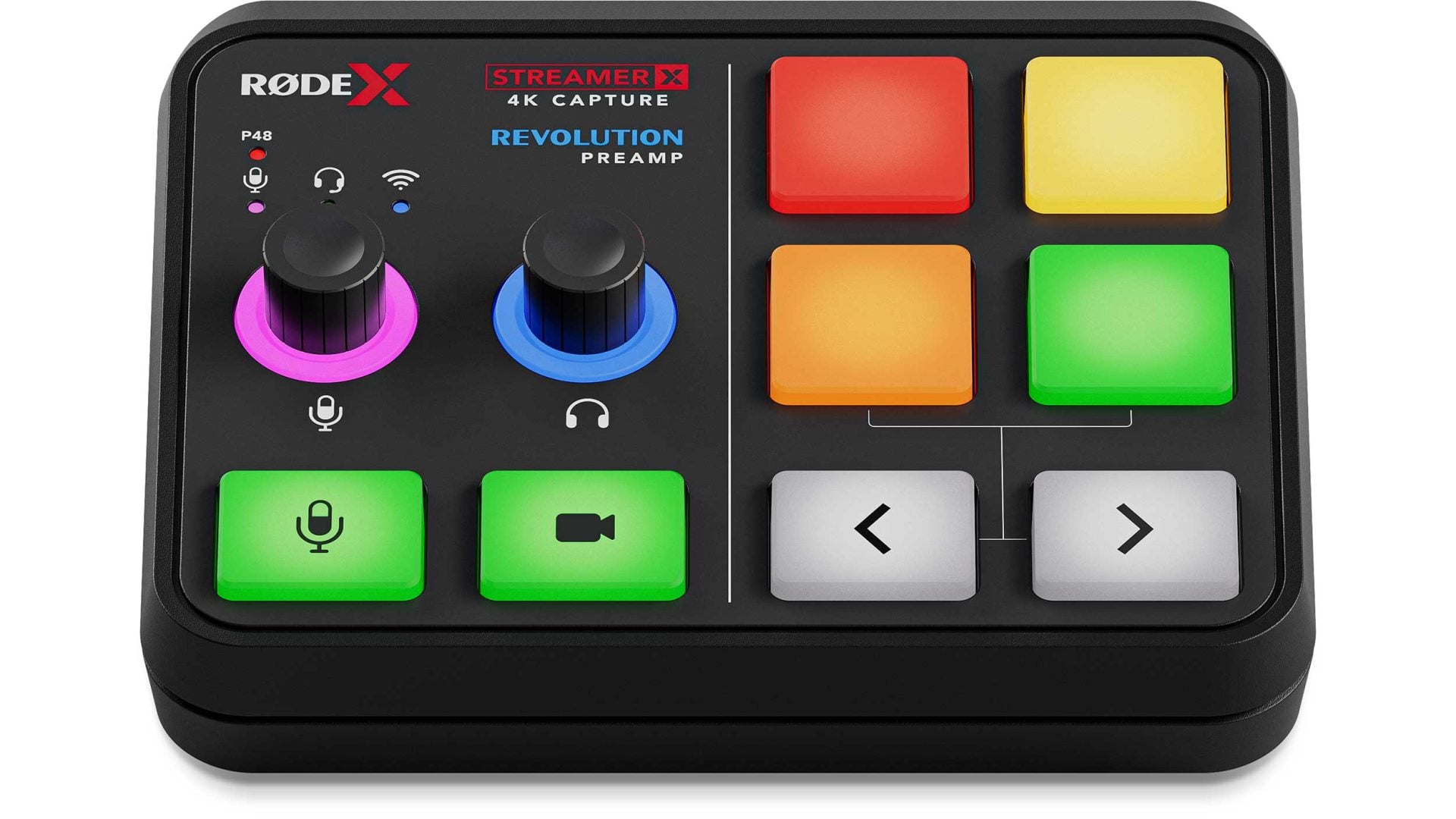 The array of knobs and buttons on the left of the Streamer X allows you to adjust microphone and headphone levels or mute audio and video entirely. The four pads on the side of the Streamer X work similarly to those found on the Rode ProCaster II, allowing you to either trigger sounds during your stream or run actions on your computer.