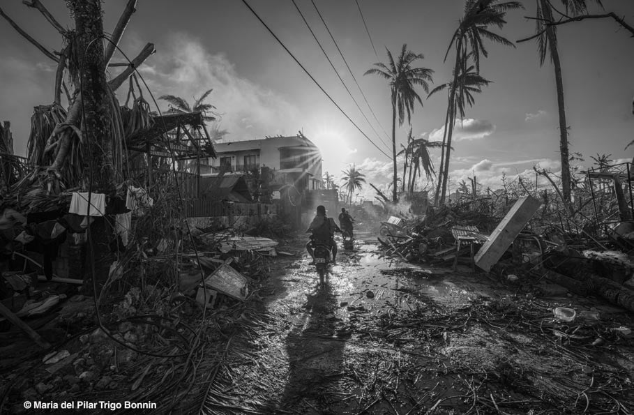 Two men ride through a road strewn with debris, heading home to what remains after Typhoon Rai (locally named Odette) tore across Siargao Island, Philippines, in December 2021. Photographer Maria del Pilar Trigo Bonnin took the shot from the back of another motorbike as they made their way through the devastation. “I handheld the camera and captured the moment quickly the stillness, the chaos, and the long shadows told the story of what we had just lived through.”