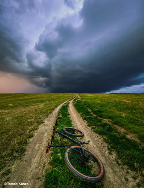 A dirt track cuts through the countryside in Ožďany, Slovakia, drawing the eye towards a sky heavy with dark, swirling clouds. In the middle of the path, a mountain bike lies still, its rider momentarily grounded by the sight ahead. “I have always been drawn to storms,” says photographer Tamás Kusza. “I love watching the sky darken, the clouds descend, and the majestic power of nature slowly unfold. Whenever I can, I hop on my bike and head for the border, where the sky and the earth meet, and where storms are born.”