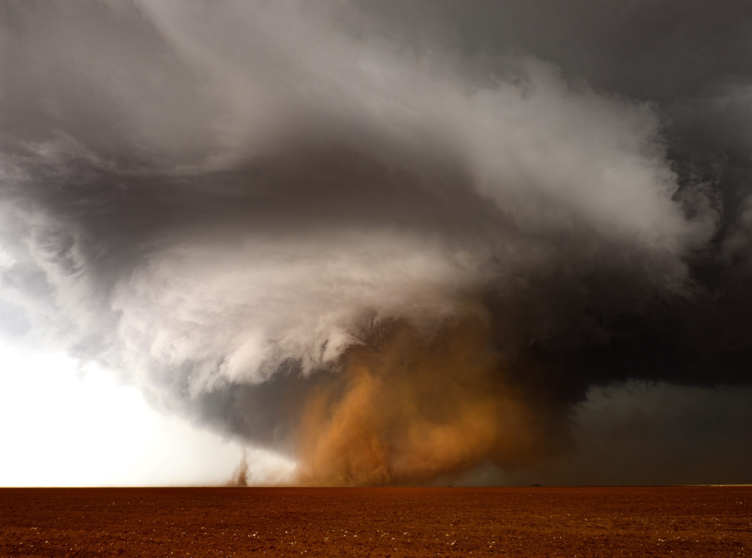 The tornado churns with intense energy, its collar cloud clearly visible as it pulls red soil into the air. A smaller satellite vortex dances nearby, while an impressive dark hail core looms behind the spiral. On the day this image was taken, hailstones up to 3 inches (7.6 cm) in diameter were reported. Judge Mette Lampcov notes: “In Texas, this is a very real image. You feel the power of weather and nature impacting the land.”