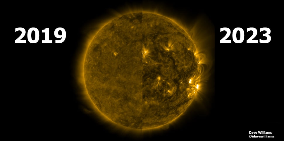 To best see the difference between what’s happening on the sun, I made a quick comparison image. Here are the Solar Flares and Active Regions of the heliosphere between December 10, 2019, and December 10, 2023: