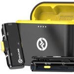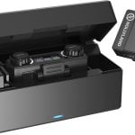 The Hollyland Lark M2 Camera Package features two transmitters and a receiver that clips onto your hotshoe. It has a 3.5mm TRS output for wiring into your camera’s microphone input. They all live inside a charging case that tops up all three units at once.