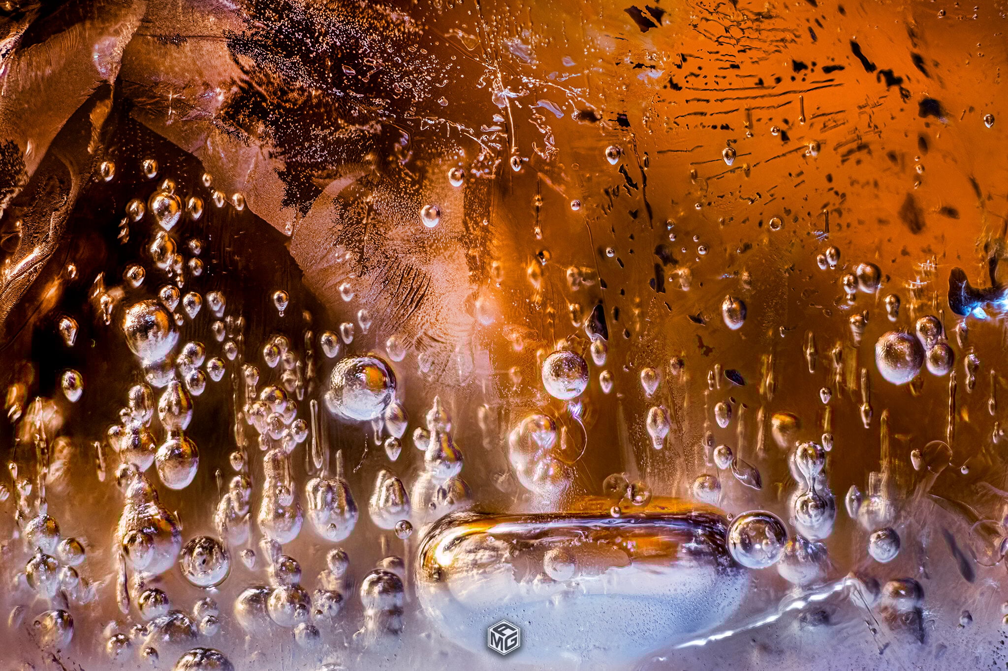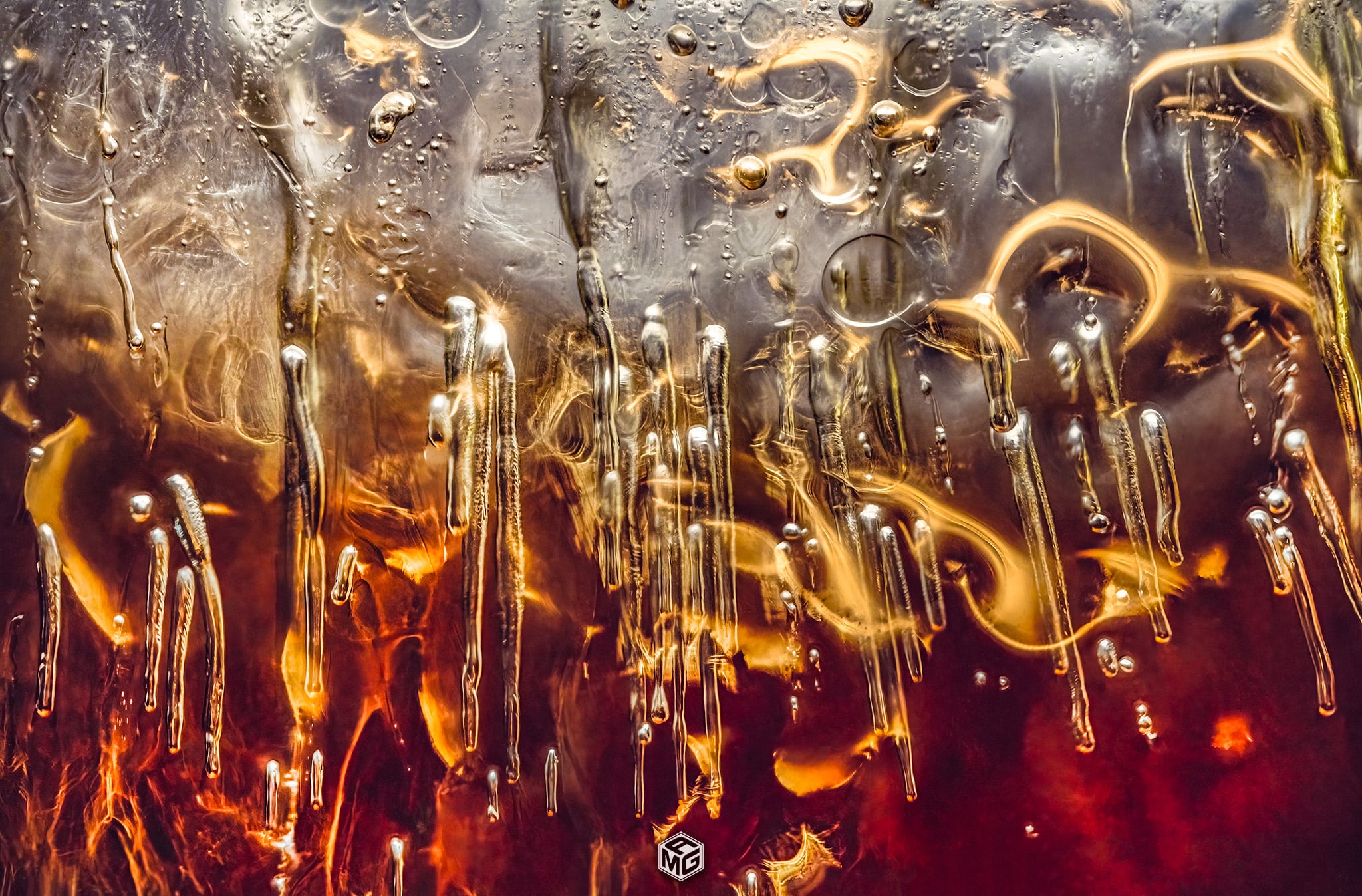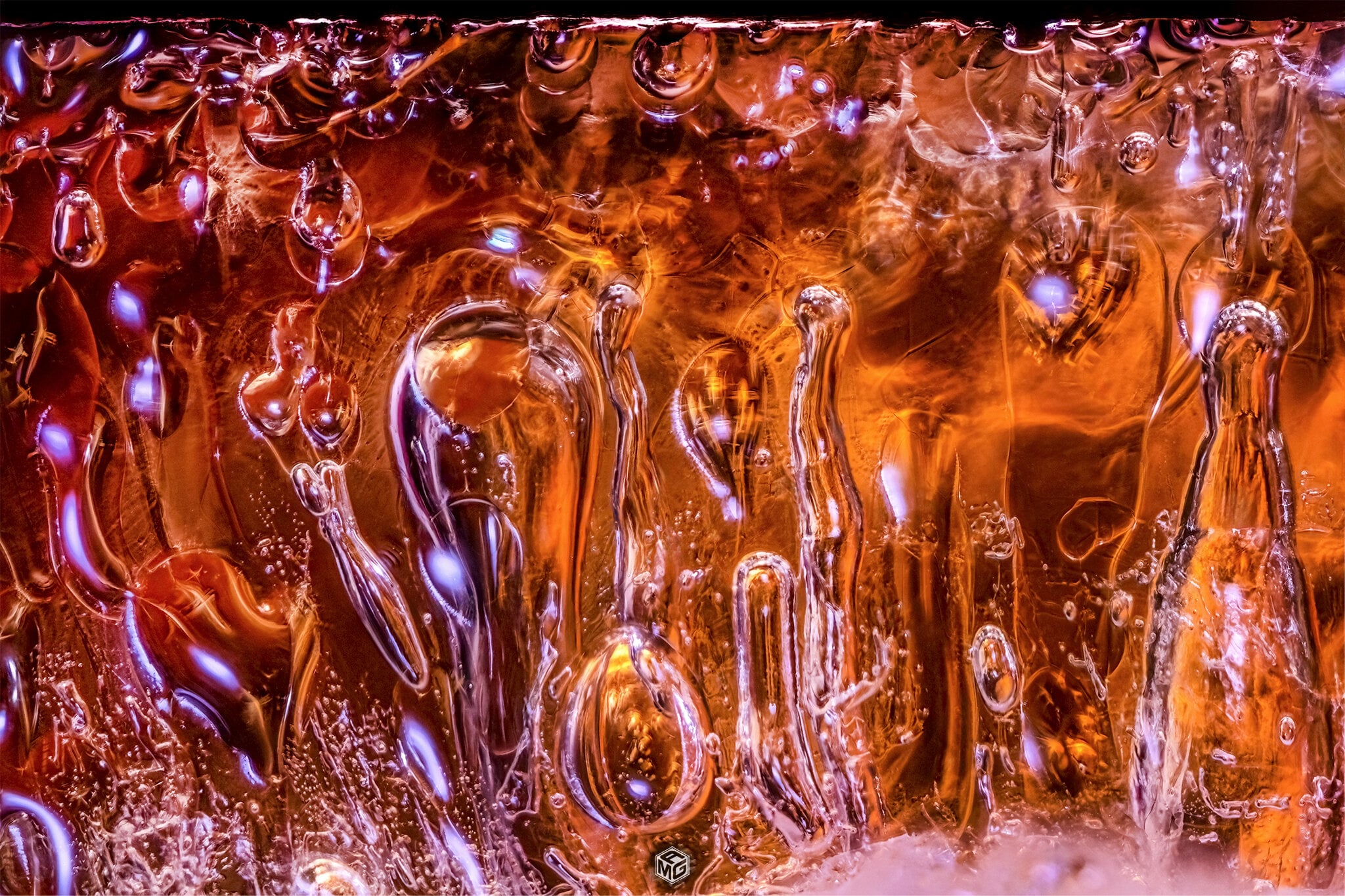 The first time I tried focus stacking an ice cube I knew this was going to be fun. It essentially captures in focus everything from the edge of the ice closest to the lens, all the way through until it can’t focus anymore. It then flattens that into an amazing, almost otherworldly scene. I have also been experimenting with different lighting setups ever since. I use 100% white light, as the Coke has so many different colors in it already, and colored light doesn’t penetrate the dark liquid quite as well. The angle of the light and the distance from the glass is what determines the colors that are going to show through in the final image.