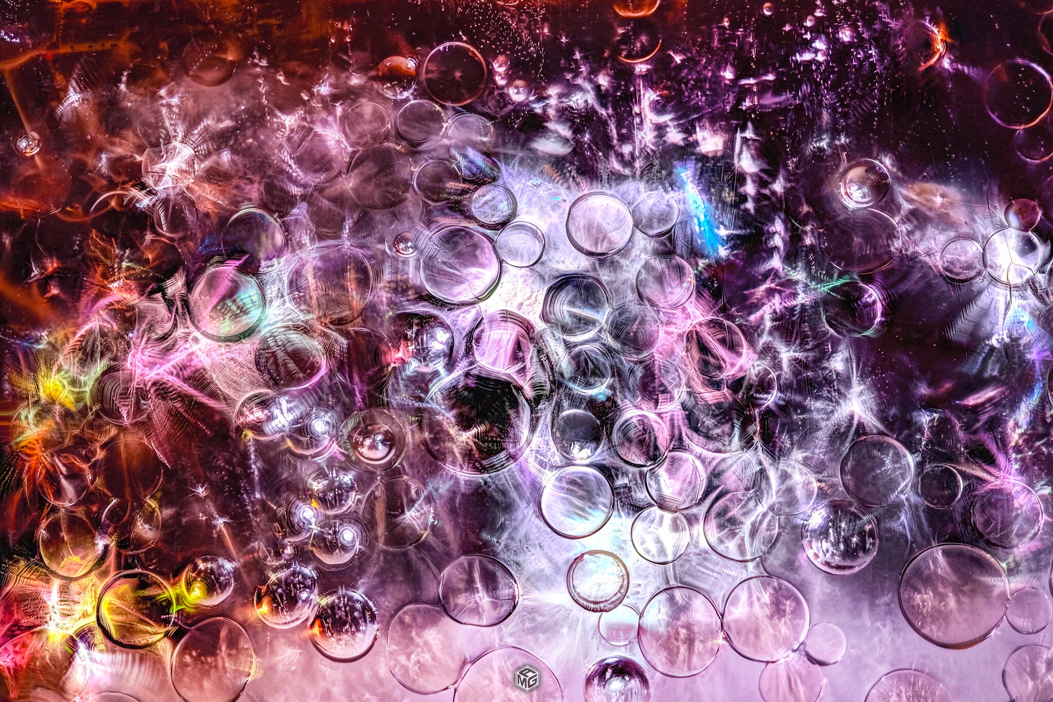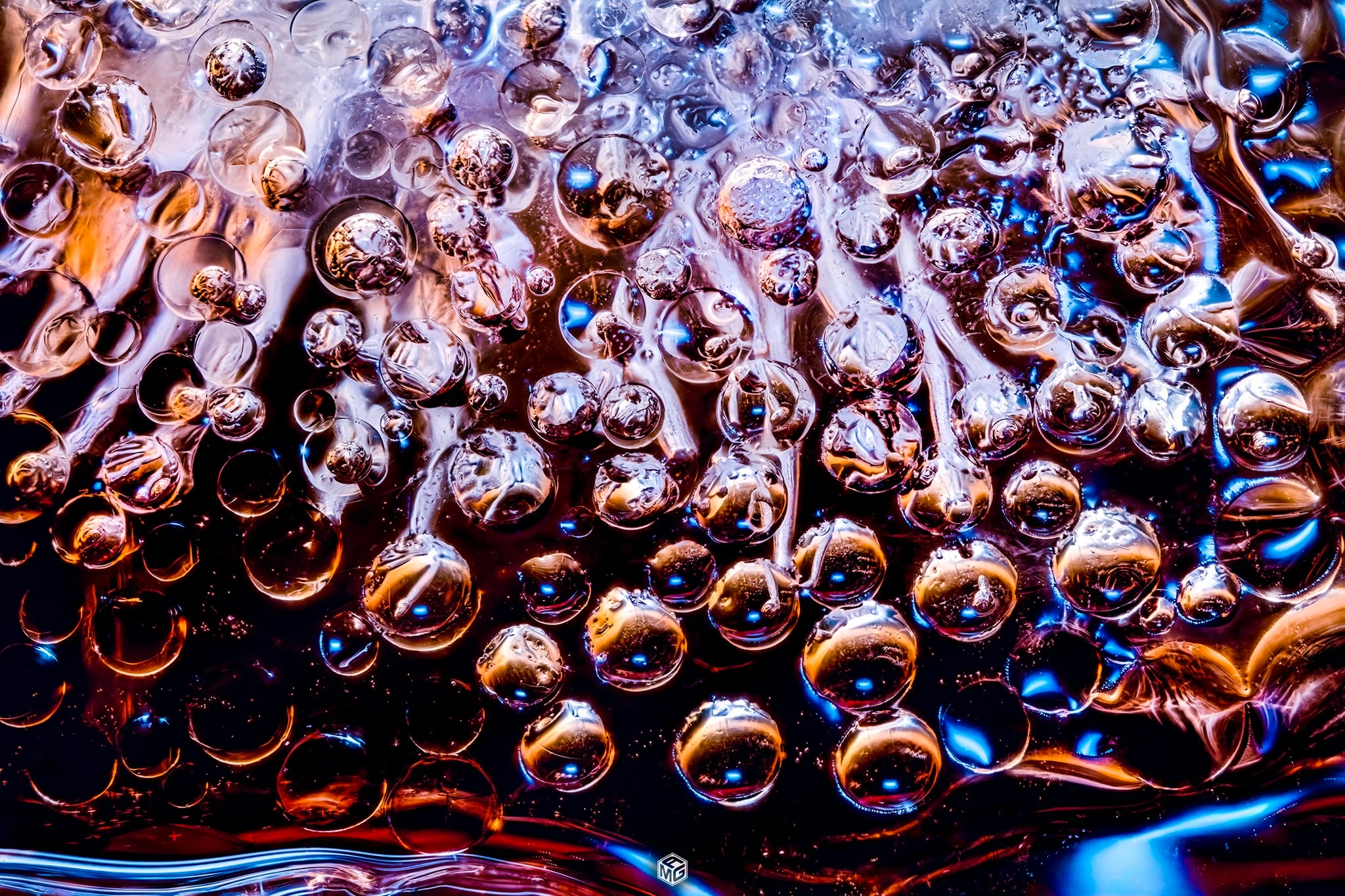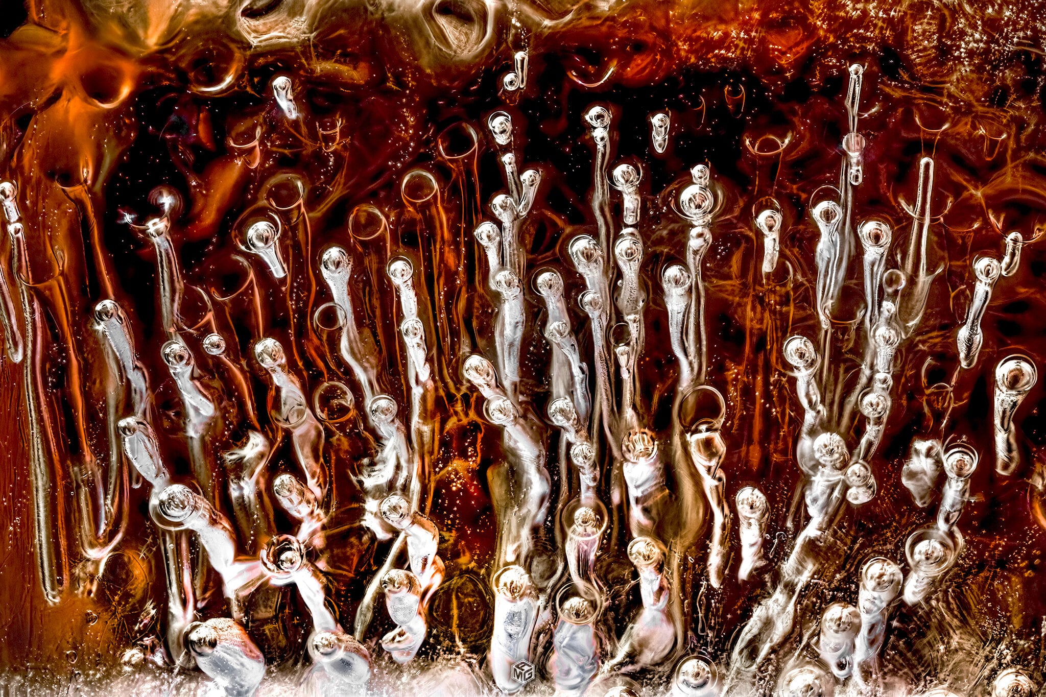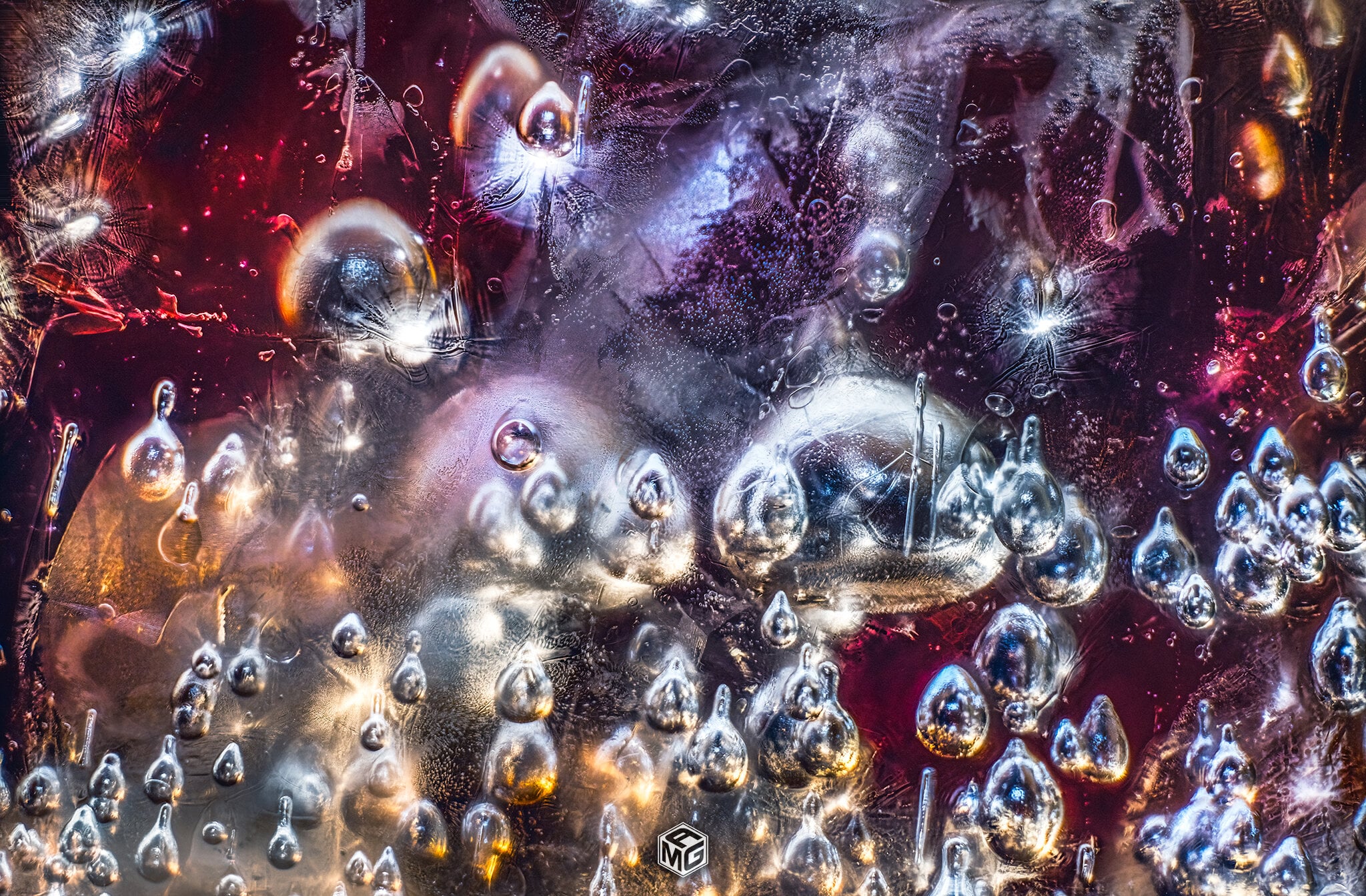 The first time I tried focus stacking an ice cube I knew this was going to be fun. It essentially captures in focus everything from the edge of the ice closest to the lens, all the way through until it can’t focus anymore. It then flattens that into an amazing, almost otherworldly scene. I have also been experimenting with different lighting setups ever since. I use 100% white light, as the Coke has so many different colors in it already, and colored light doesn’t penetrate the dark liquid quite as well. The angle of the light and the distance from the glass is what determines the colors that are going to show through in the final image.