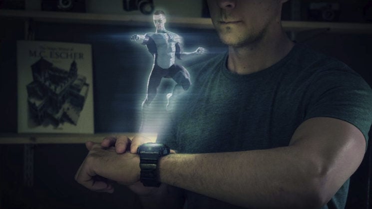 The principle is fairly straightforward. Create the image you want to project, give it some distorted scan to give a 3D projected appearance, and slap it on top of your background. Then it’s just a case of adding some glow to the parts of your scene that might naturally be lit by the hologram if it were real.