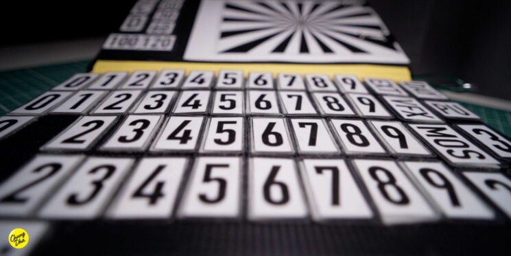 On the back of the slate I have all the tags I need to switch with. I made the tags myself, I designed them and printed them out on just a single a4 paper, then had to cut out all the tags so we can laminate them loose from each other as there needs to be enough plastic between the tags to seal them from the elements. Then cut out each and pasted velcro tape on each of them. You can find the PDF for this here, but I designed it specifically for this clapperboard, if you have a different one the size might not be that compatible.