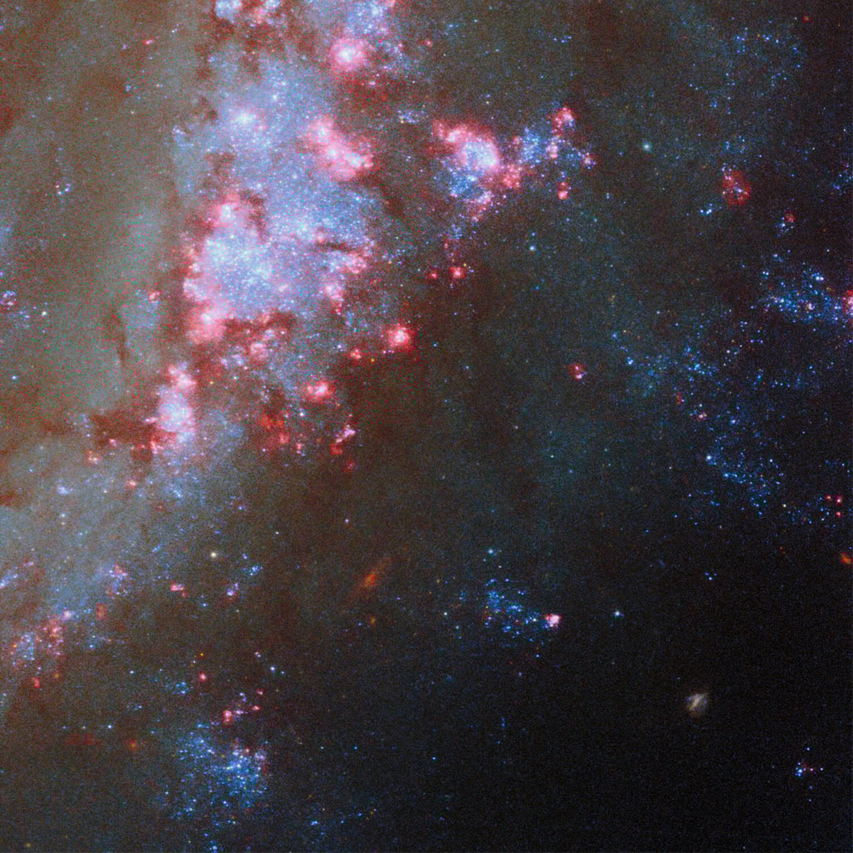 - The soft pink regions represent H II regions. These are clouds of hydrogen gas ionised by strong ultraviolet radiation from young stars. When the ionised gas recombines, it emits light in a characteristic red tone, especially in the H-alpha line. Hubble captured this image using a filter centered near 657 nanometers, which isolates emission from hydrogen and nitrogen.