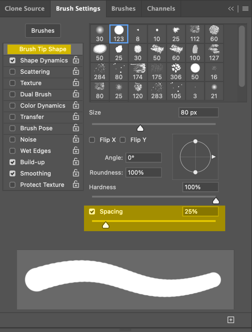 2. Find Spacing: Look for the Spacing slider under the Brush Tip Shape section.