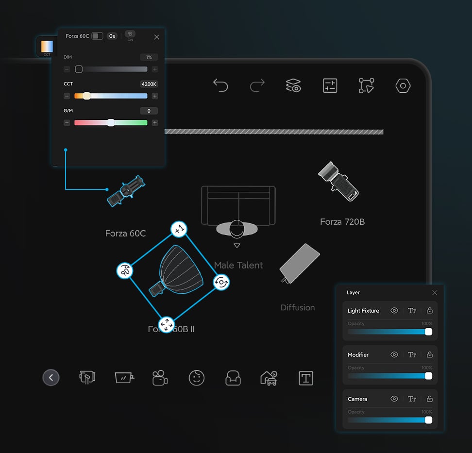 As well as placing lights and other equipment around the layout, you can also add modifiers. There are a bunch of specific models of light, but there are also modifiers, including Fresnel/projector lenses, softboxes, diffusers and more.