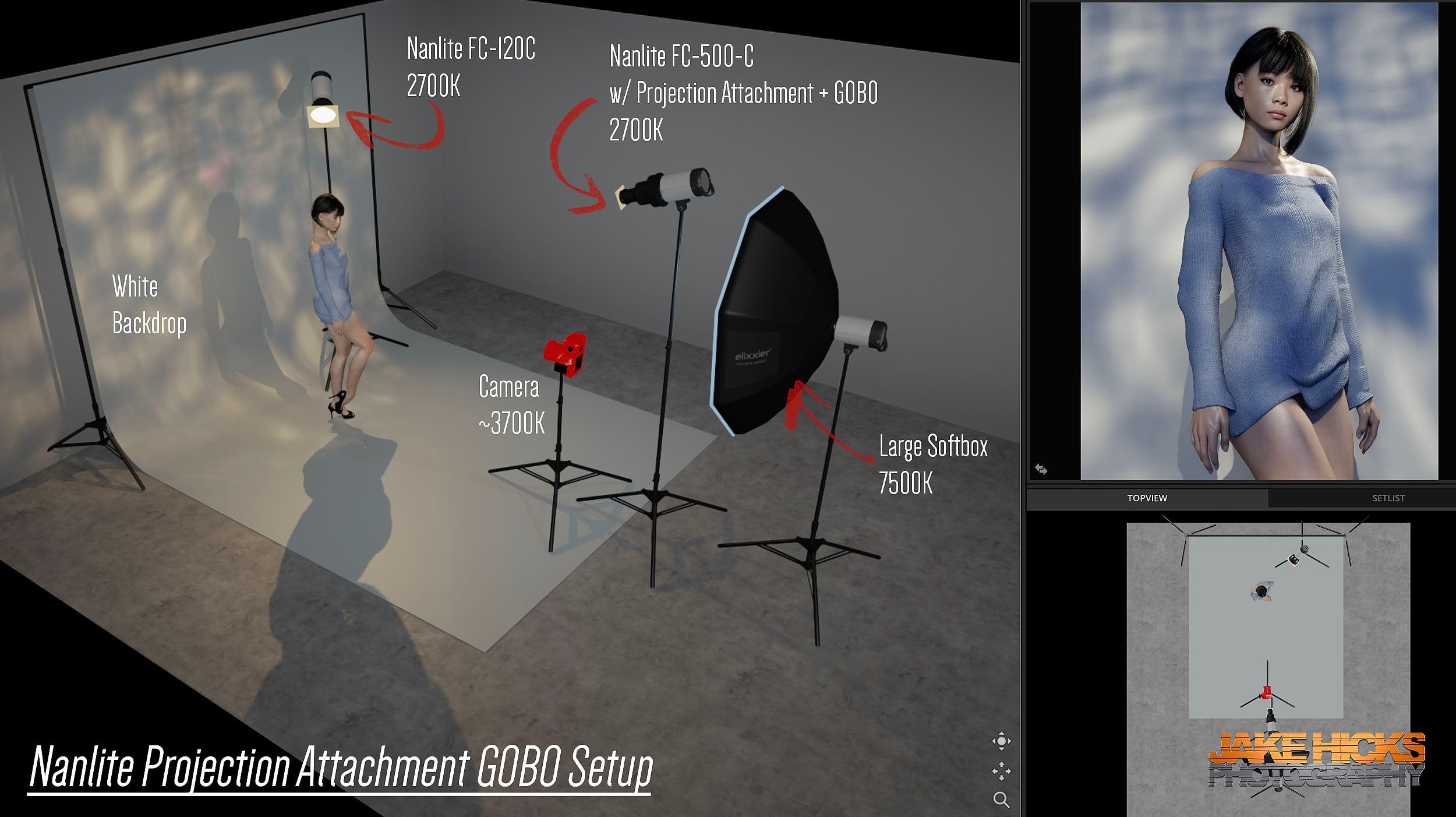This technique is fairly simple, as it’s a familiar formation to many of us: Main light flooding the scene, hair light placed behind, and then a soft light to fill in the shadows. The only slightly more complicated part is the Kelvin manipulation.