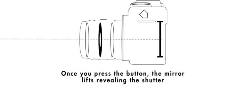 When you press the button, the mirror flips up. This is why you can’t see through the viewfinder when you’re taking a shot. The image simply isn’t reflecting off the mirror and through the eyepiece any more. Instead, the image is projected straight toward the film plane. Or, in the case of DSLRs, the sensor.