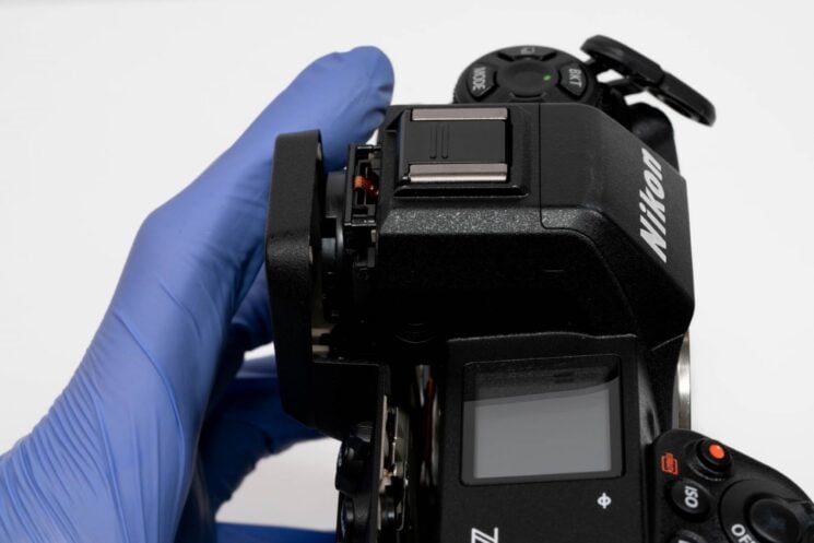 Next, we’ll disconnect the two sensor ribbons. The Z9 can pull off its no-blackout shooting by running the data from the sensor to the processor/screens and the cards separately, allowing it to remain completely active while recording photos.