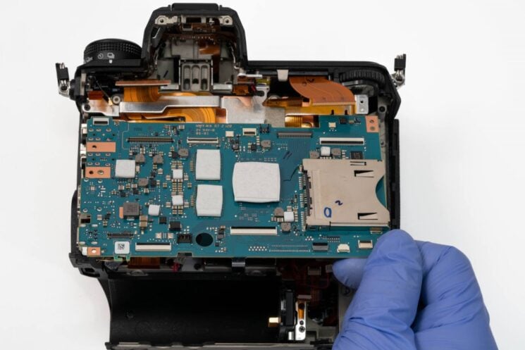 Now we’re at the motherboard. They designed the heatsink frame around the expeed 7 processor, which will transfer heat out while guiding it to the shell. They went for a more minimalist design with it, keeping it open and off the other connectors, creating better guidance for the heat.