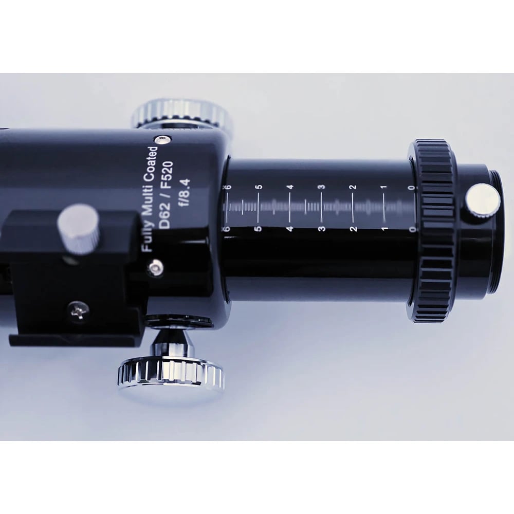The telescope combines a 62 mm aperture with a 520 mm focal length, producing a focal ratio of f/8.4. These parameters place it in the moderate focal length category rather than the ultra-wide astrograph class. More importantly, the optical system incorporates built-in field correction. As a result, the instrument aims to deliver a flat imaging field without requiring external flatteners.