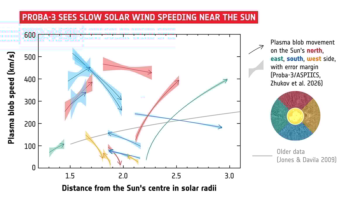 The European Space Agency’s Proba-3 mission has provided new measurements from this critical region using its formation-flying coronagraph system. Early observations indicate that plasma associated with the slow solar wind moves significantly faster near the Sun than previously predicted by models. These results mark the first major scientific outcome of the mission and also show the value of long-duration artificial eclipse observations in space.