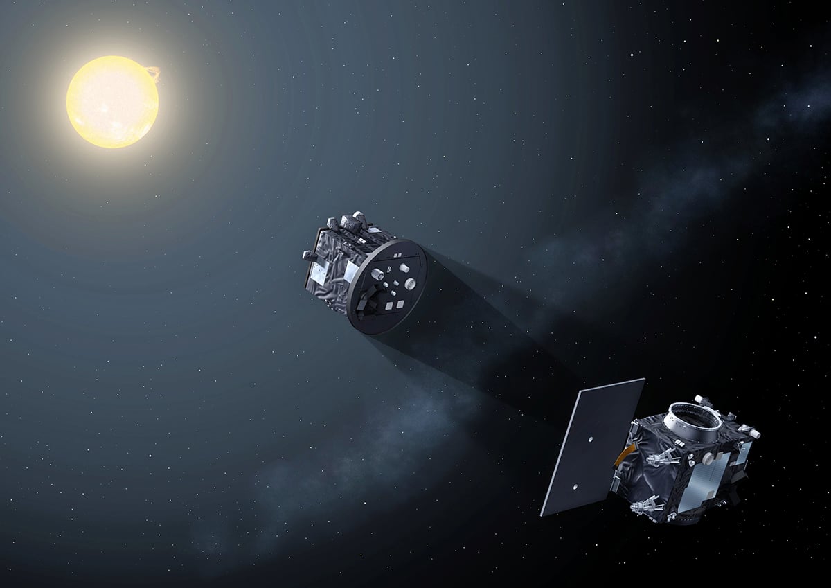 The Proba-3 mission uses two spacecraft flying in precise formation to create an artificial solar eclipse in orbit. One spacecraft carries an occulting disc. The second spacecraft carries the ASPIICS coronagraph. Together they form a single large optical system separated by about 150 metres.