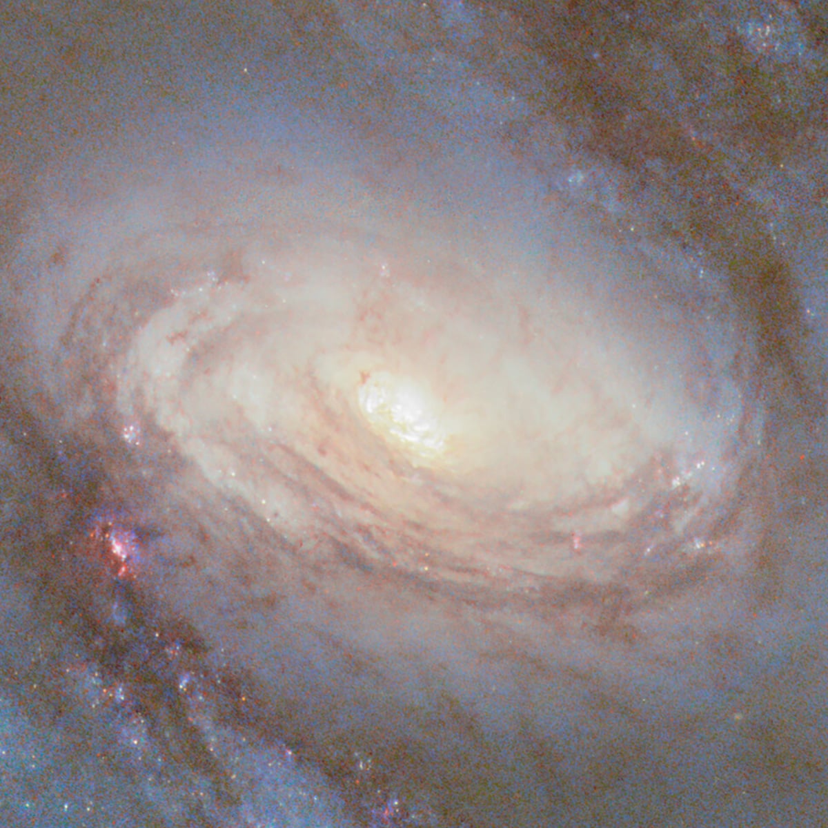 The new Hubble image captures the central region in extraordinary detail. The view spans about 2.6 × 2.3 arcminutes, enough to frame the core and its surrounding structures. Streams of dark dust trace the spiral pattern inward, guiding gas toward the center. Within that core lies a ring of star-forming regions, glowing in shades of pink and blue. Those colors correspond to hydrogen and young, hot stars, the by-products of intense stellar birth.