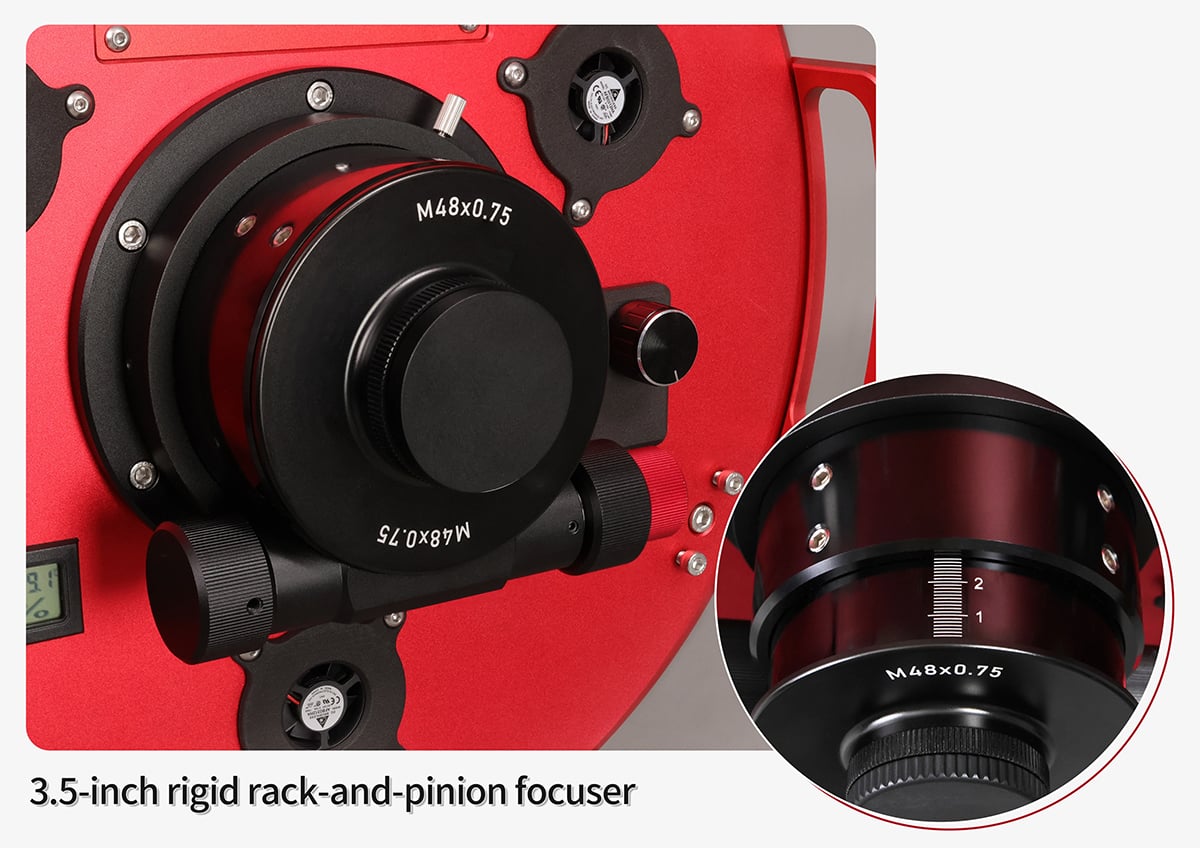 The mirror cell and rear assembly support active cooling. Sharpstar includes three rear-mounted cooling fans. These fans accelerate thermal equalization of the primary mirror. Faster equilibrium reduces internal tube currents. This improves image sharpness earlier in the session.