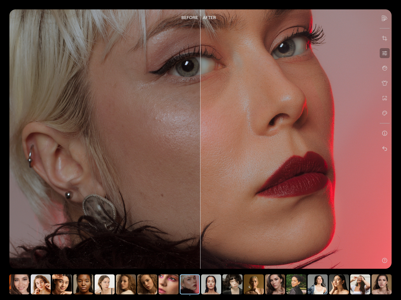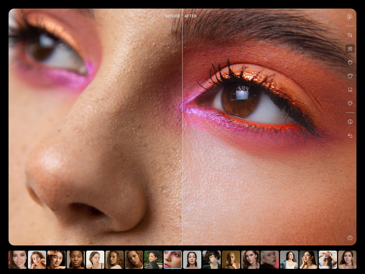 - Eye Enhancement: Tools for iris flare, redness removal, and eye shape adjustments.