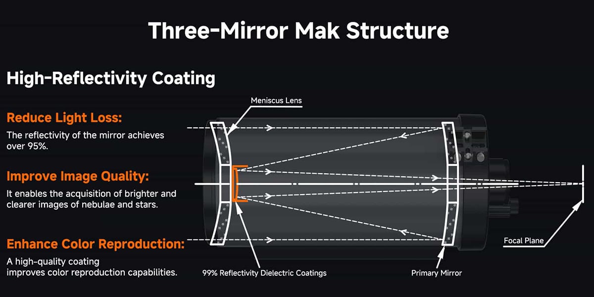SVBONY equips the MK127 with advanced coatings. These include 99% high-reflectance dielectric coatings on the mirrors. Dielectric coatings reflect more light than traditional aluminum coatings. This boosts brightness and contrast.