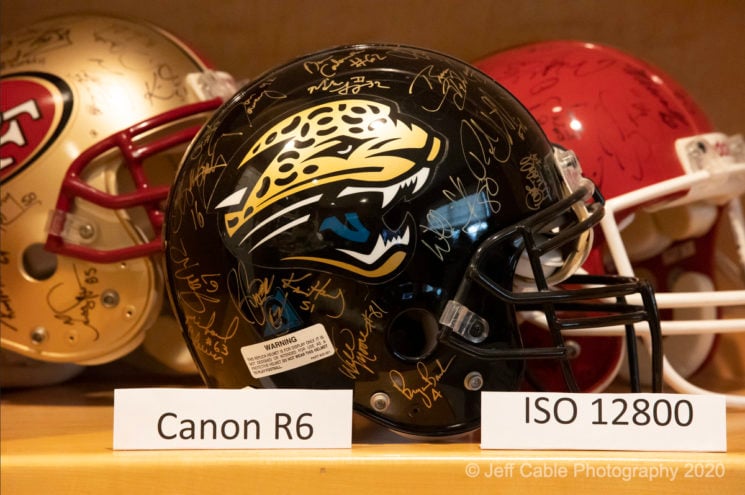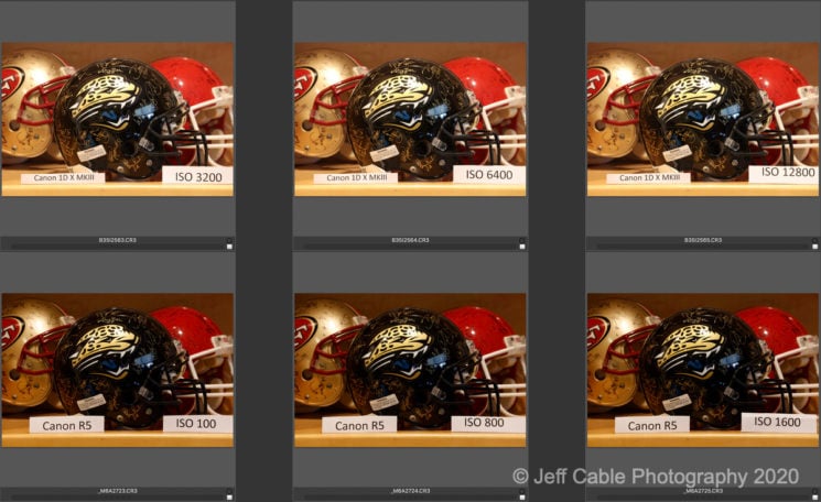 In order to try and keep everything as consistent as possible, I put together a plan to use as much of the same hardware as possible. Since I had the RF adaptor in my possession, I decided to use the Canon 70-200mm 2.8 L lens which could then be mounted to my DSLR cameras and the new mirrorless cameras (using the adaptor). I mounted the Canon 70-200mm lens onto my Gitzo tripod, zoomed it to 200mm and pointed the lens at a dark object in my office (which turned out to be a black NFL helmet in my collection). I decided to set each camera to aperture priority mode at f/8 and vary the ISO levels from 100, 800, 1600, 3200, 6400 and 12,800. I chose these ISOs since they most represent what I typically use for my work. I went as high as 12,800 even though I almost never shoot anything above ISO 10,000.