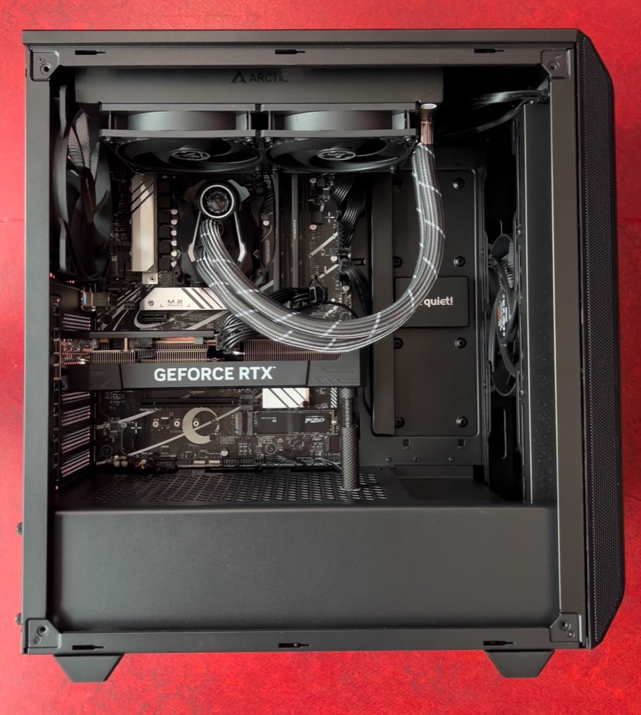 To make the system as silent as possible, I went for an all-in-one water cooling from Artic / the Artic freezer 240 and the Be Quiet pure base 500 case. Both brands I know from back then and they are still great today. For the power, I went for the Corsair RM750x Shift Fully Modular ATX Power Supply because the plugs are all on the side and much more easily accessible than on usual power supplies. I calculated the needed power supply here.