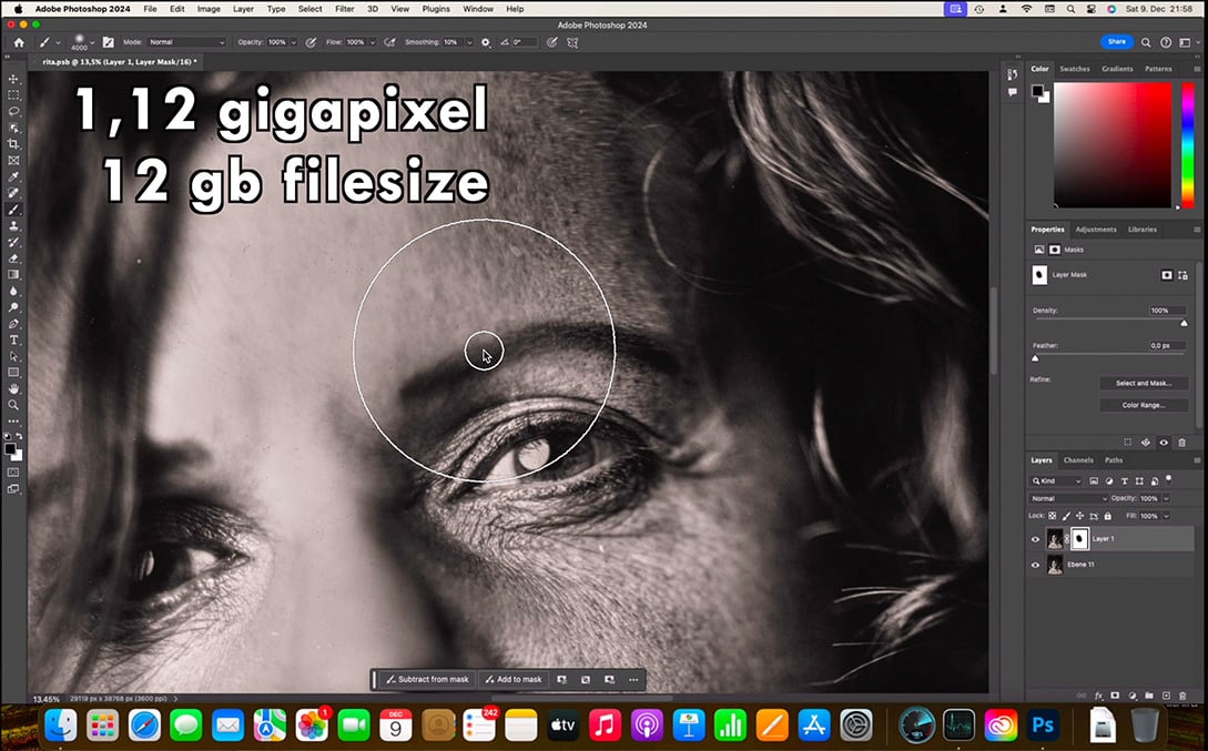 The tasks were the same, but the file size was very differrent. The 1.12 gigapixel psb file has over 12gb. After all the Lightroom tasks and the previous Photoshop actions on the large scan, the Mac mini ran out of space on the SSD and got a scratch disk entire message. With a bigger external SSD you could avoid this issue, but I thought it’s not a fair comparison if I “modify” the base model.