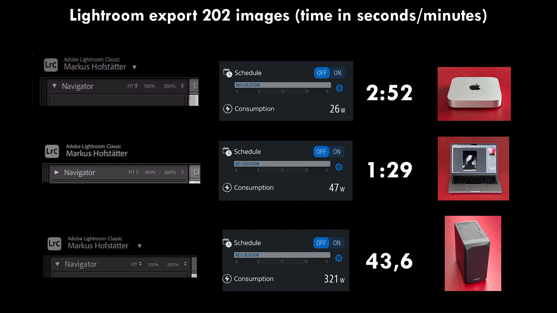 All three machines imported the images very quickly. But as you can see, the power consumption is on a totally different level. I use the M2 Mac mini with a “docking unit” that has an integrated SSD, thats the reason it consumes a bit more power than the MacBook.