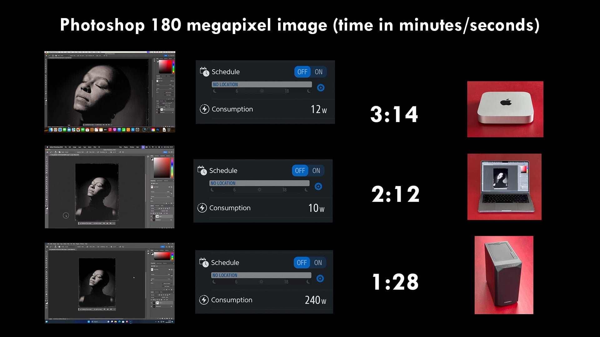 Opening the 180-megapixel image, zooming in and out, duplicating the layer, applying dust and scratches painting in a mask, and saving the file afterward again. Again the Windows machine shows again that it can outperform its competitors. But the Mac’s crush the Windows machine power consumption-wise.