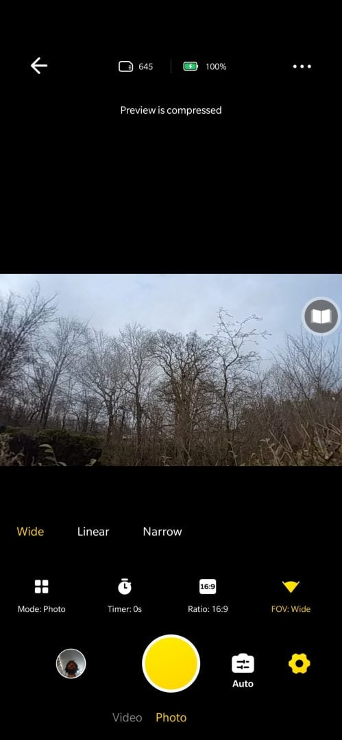 The third method to control the camera, which I mentioned briefly above is the smartphone app. For shooting, we get a wide array of configuration options (as you can see from the array of screenshots below) for shooting both photos and videos, including exposure compensation, ISO sensitivity, white balance, shutter speed, timer delays (gotta get into position for that selfie!), aspect ratio, shooting duration, field of view, colour profile (yes, this thing has LOG) and you also get a 3×3 grid for when you want to make sure your shot lines up with the rule of thirds.