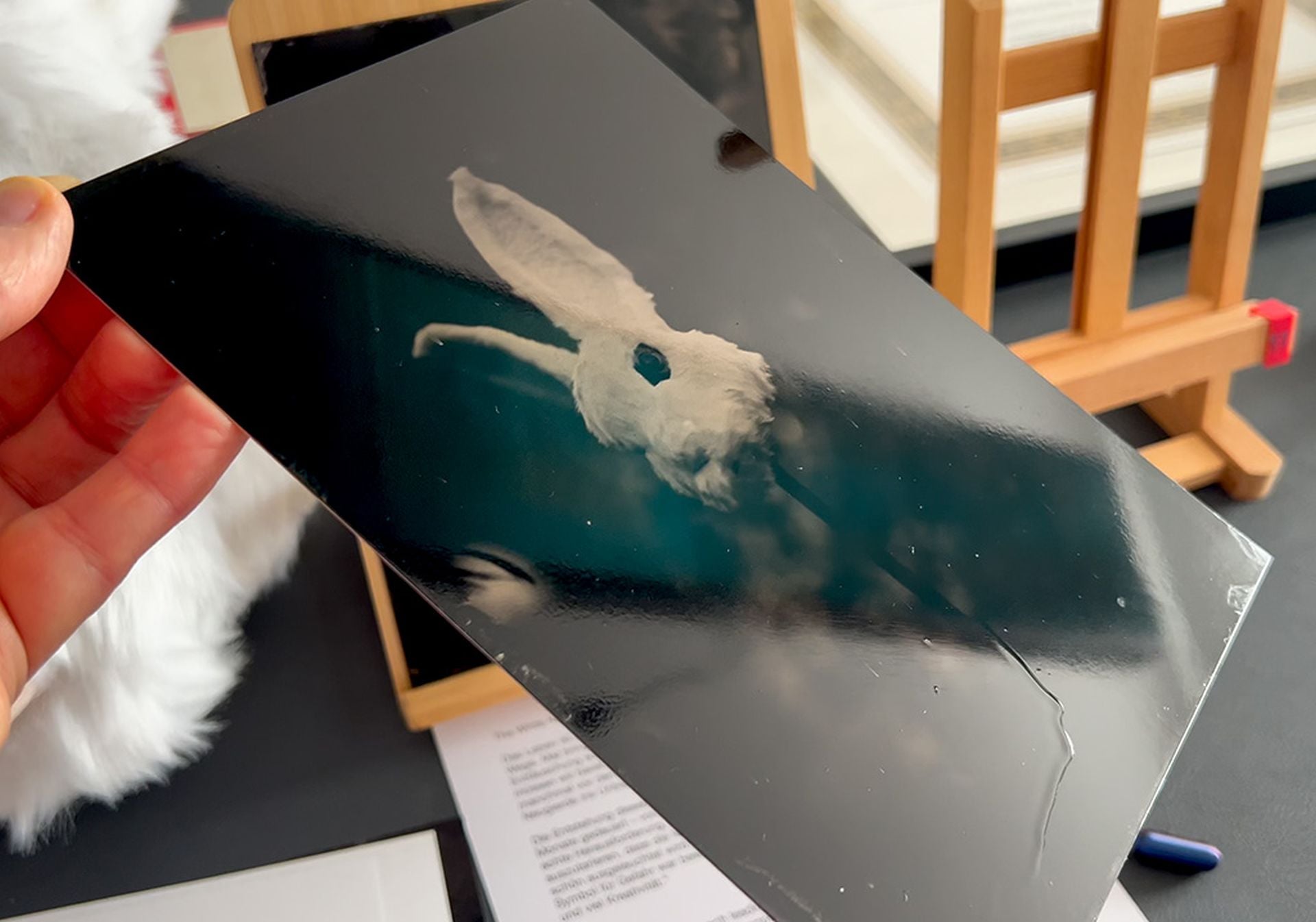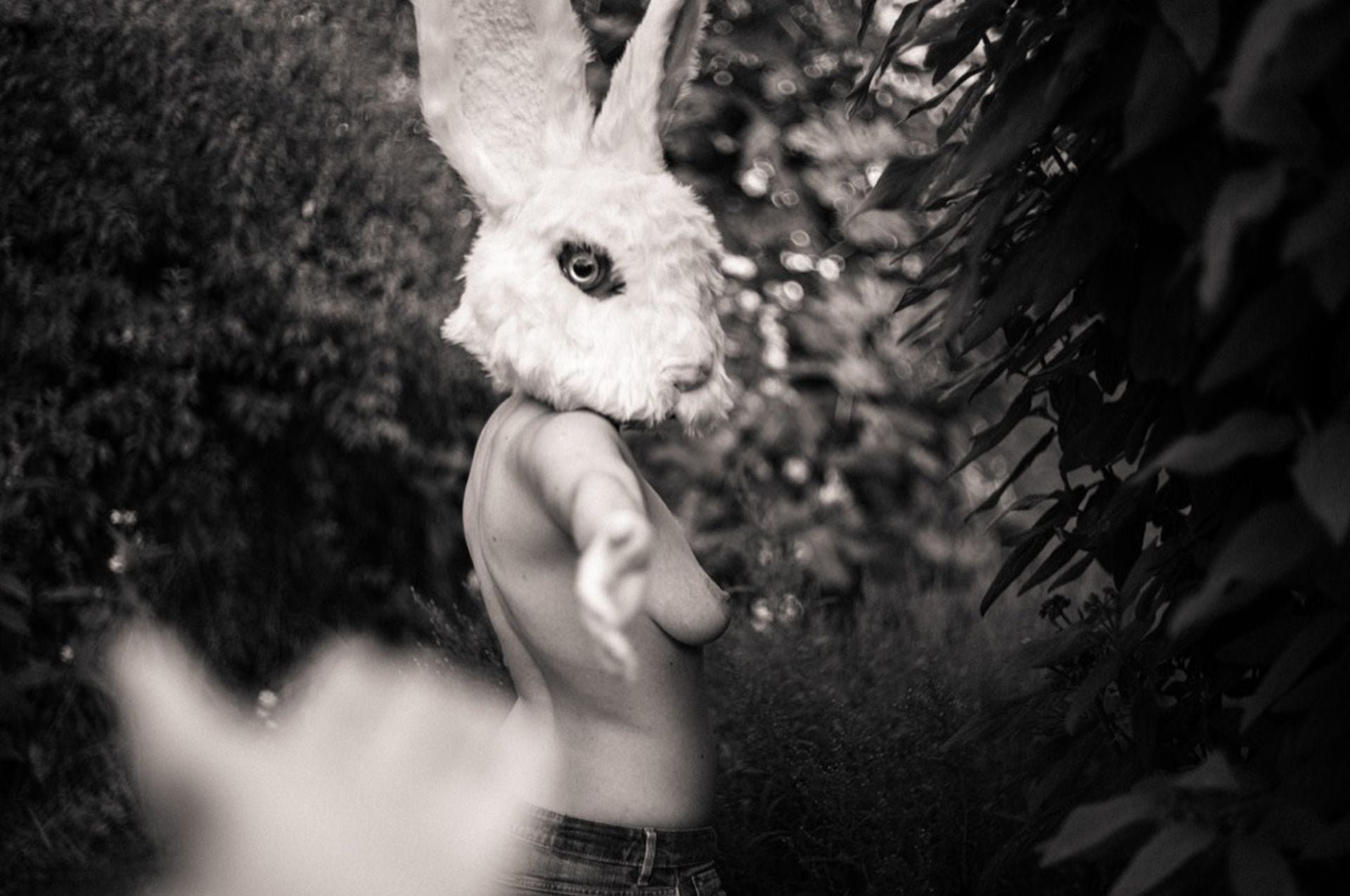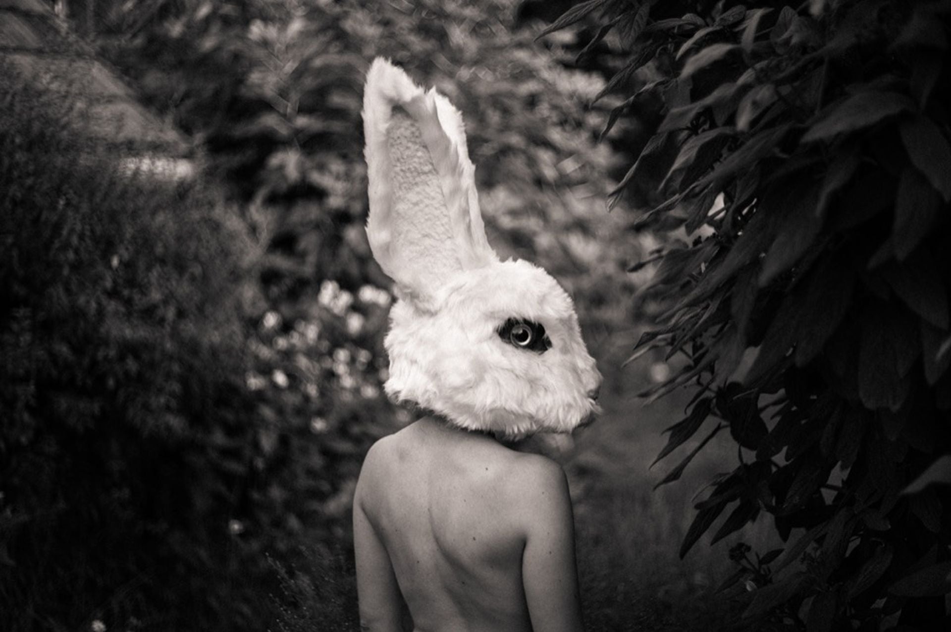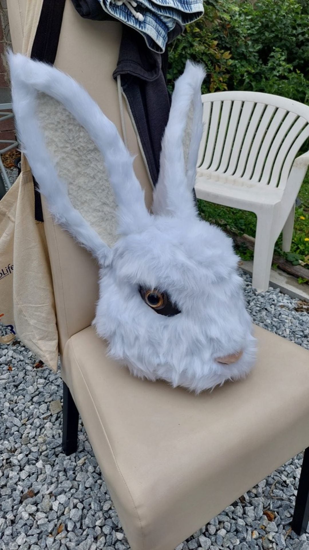 After I had the Mask I needed to find a place and like I showed in the Video, I was happy to be able to shoot it in my own garden with that spiky tree in front of the rabbit, that suggests a bit of danger in the choices we make.