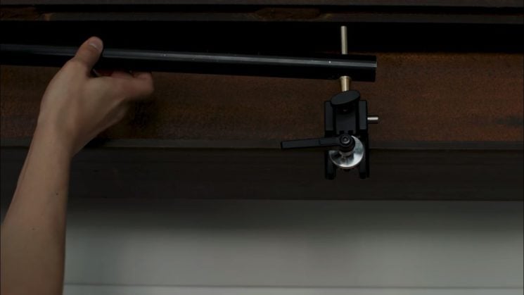 Mango Street duo first screwed post adapters onto the super clamps studs. Then, they securely attached both clamps to the I-beam, added the crossbar and the paper roll, and that was it! This setup cost around $116, but the couple suggests another one, which you can make for less money.