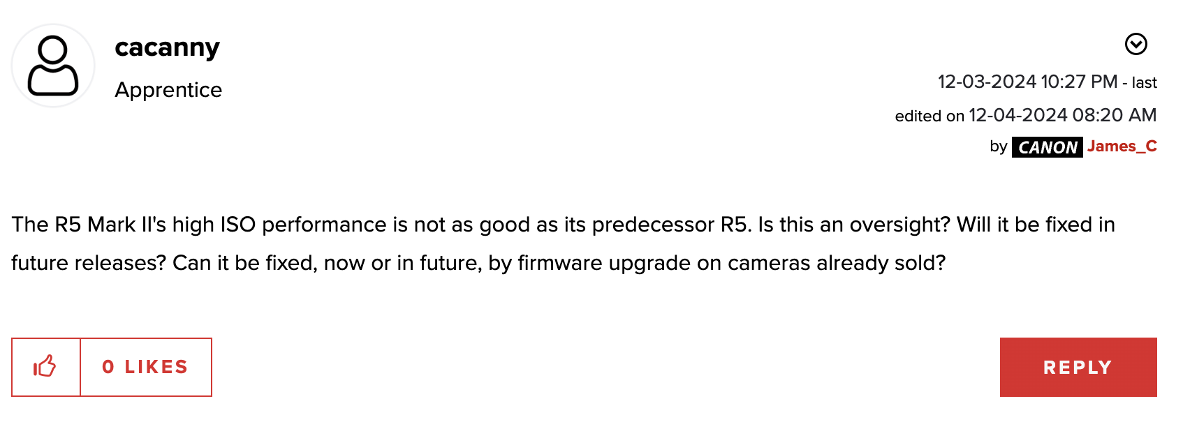 7 responses to “Users are unhappy with the Canon R5mkII low light performance”