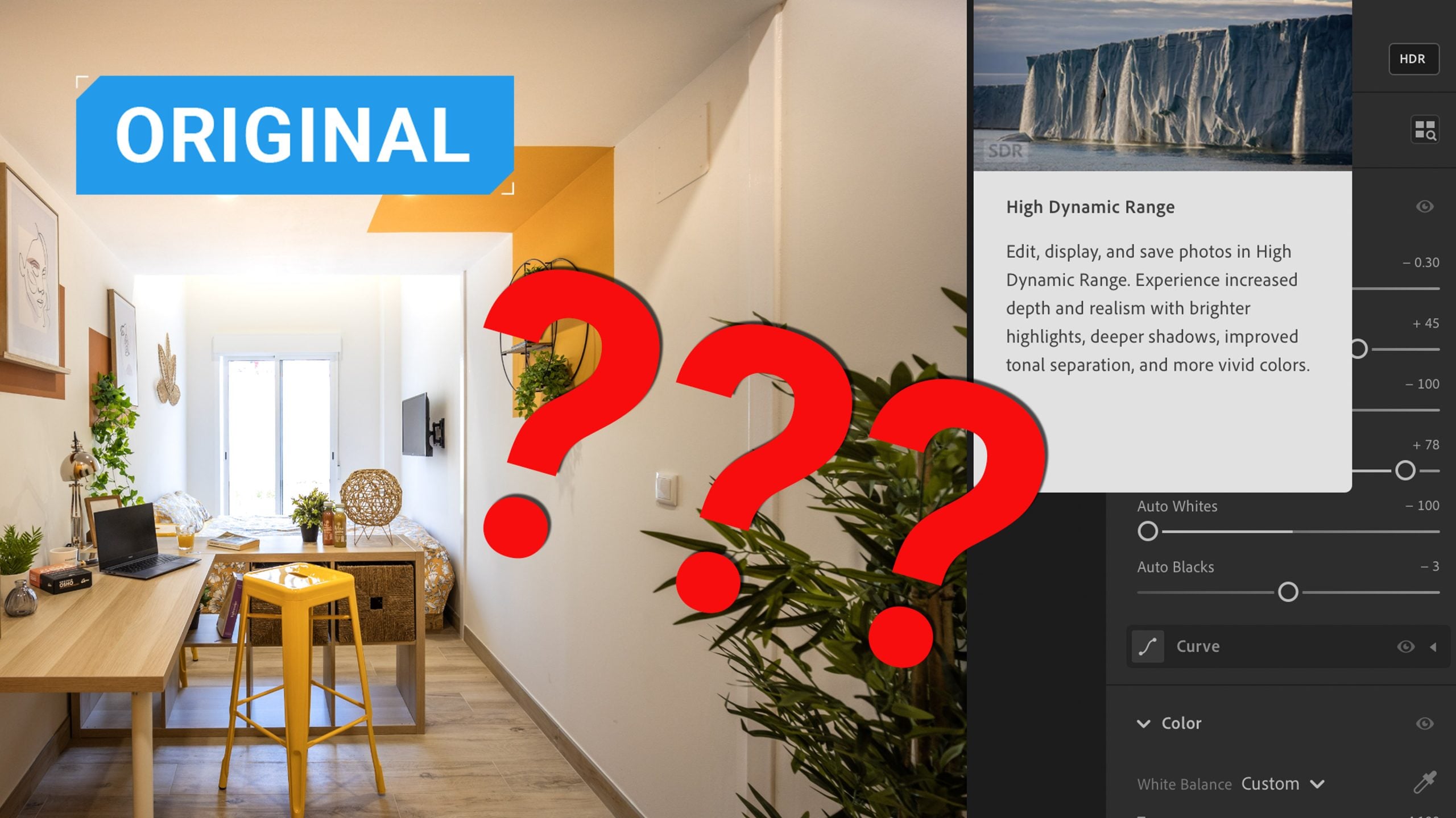 Except that it can affect the overall output, as my oversight shows. There is an SDR tab that you can open to check how the image will look without the HDR screen. I would be extremely careful because I found that generally, the images looked a lot worse, even after tweaking this, than they looked ordinarily.