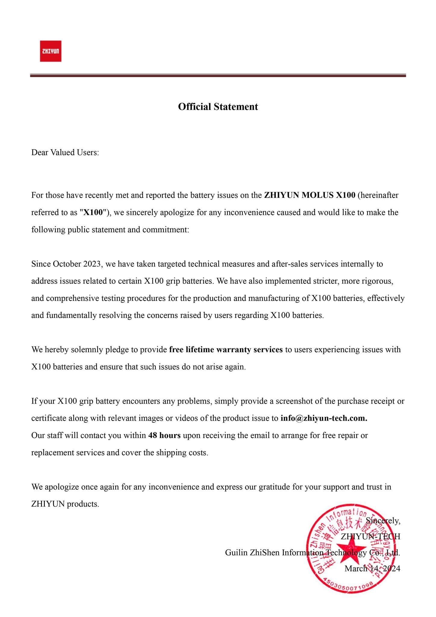 Zhiyun responds to Molus X100 battery issues with free lifetime warranty